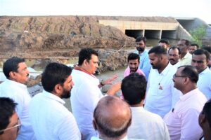 मागील काही महिन्यांपासून कोपरगाव तालुक्यात या समृद्धी महामार्गाचे काम अतिशय संथ गतीने सुरु असल्यामुळे मागील काही दिवसांपासून पावसाची संततधार सुरु असल्यामुळे महामार्ग ओलांडून जाण्यासाठी निर्माण करण्यात आलेल्या डकमध्ये अनेक ठिकाणी मोठ्या प्रमाणात पाणी साचल्यामुळे लगतच्या शेतीचे व रस्त्यांचे मोठे नुकसान झाले आहे. त्याबाबत या अकरा गावातील नागरिकांनी ना. आशुतोष काळे यांच्यापुढे होत असलेल्या त्रासाचा पाढा वाचला होता. त्याची दखल घेवून ना.आशुतोष काळे यांनी कोपरगाव तालुक्यात सुरु असलेल्या संपूर्ण ३० किलोमीटरच्या समृद्धी महामार्गाची पाहणी करून सबंधित अधिकाऱ्यांना सूचना केल्या आहेत. यामध्ये चांदेकसारे गावातील चराच्या पाण्याचे नियोजन करणे, देर्डे कोऱ्हाळे, पाथरे शिव रस्त्यावर मोठे सिमेंट पाईप टाकणे,कोकमठाण पुणतांबा रोडवरील डक मधील खड्डे बुजवणे, चर काढून साचलेल्या पाण्याची विल्हेवाट लावणे, कोकमठाण कारवाडी सडे कोकमठाण डक मधील साचलेल्या पाण्याची व्यवस्था करणे, चांदेकसारे येथील ५२५ डक वर साचलेल्या पाण्यामुळे शेतीचे मोठ्या प्रमाणात नुकसान होत असून भविष्यात असे नुकसान नुकसान होणार नाही त्याबाबत कायमस्वरूपी उपाय योजना करा.धोत्रे लौकी येथील पुल वाहून गेला असून आहेर वस्ती रस्ता पूर्ण पाण्यात गेला आहे त्याबाबत तातडीने काम सुरु करा. वारी भोजडे रस्त्यावरील वीरभद्र मंदिरा शेजारील साचलेले पाणी काढून देण्यासाठी चर काढून द्या, धोत्रे येथील डक मध्ये पाणी साचल्यामुळे कांदा चाळ व घरात पाणी शिरले,धोत्रे वारी,धोत्रे लाख रस्ता पूर्ण खराब झाला आहे त्यामुळे हा डक साफ करून पाणी काढून द्या,धोत्रे भोजडे शिवार रस्त्याला चर काढा,चांदेकसारे इस्लामवाडी रस्ता काँक्रीटीकरणाची भिंत वाढवा अशा सूचना ना. आशुतोष काळे यांनी उपस्थित अधिकाऱ्यांना दिल्या आहेत.